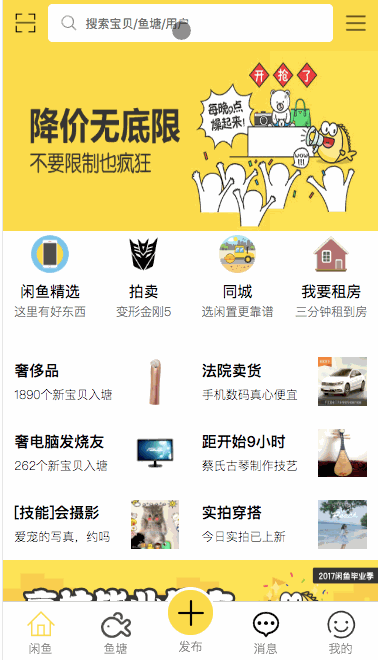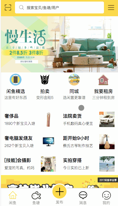 每次写文章时,总会觉得比写代码难多了,可能这就是我表述方面的不足吧,然而写文章也是可以复盘一下自己的开发过程,对自己还是受益良多的。在这里简单叙述一下我仿某鱼部分布局以及功能实现的过程,仅做学习用途。
