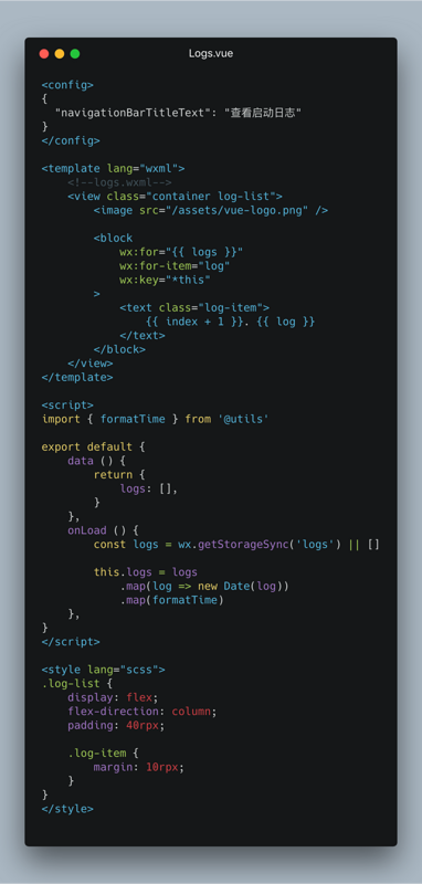 <config> { "navigationBarTitleText": "查看启动日志" } </config> <template> ... </template>但是并没有将 app.json 的内容放到 App.vue 中,因为有时需要读取这里的页面配置。如果写到 <config> 中的话,就无法读取了...