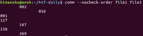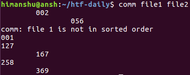 正如我们所知道的,comm 只可用于排序好的文件。如果发现其中一个文件未排序好,那么便会在输出中产生一条信息来告诉用户。比如,我们交换 file1 的第一行和第二行,然后与 file2 进行比较。下面是该命令的输出: