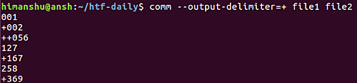 默认情况下,comm 命令的输出列之间是以空格分隔的。然而,如何你想使用一个自定义字符串作为分隔符,那么你可以使用 --output-delimiter 选项。使用该选项时需要指定你想用来作为分隔符的字符串。