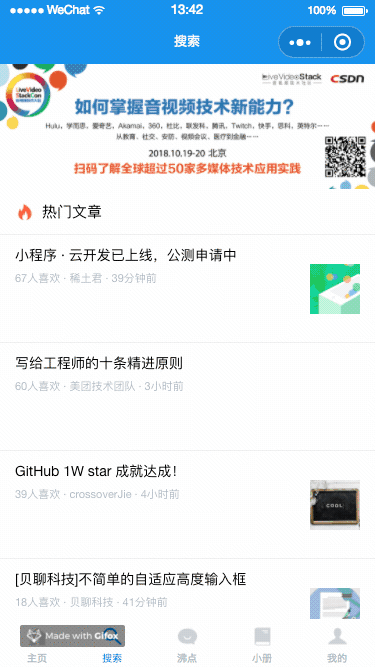 搜索 tab 页两部分组成:顶部的 swiper 和下面的热门文章列表,这里复用 postItemOne 组件即可。顶部的 swiper 在首页已经预先获取过了(见上面),这里直接读取即可。实现如下:
