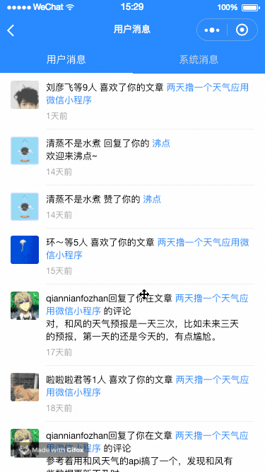 API需要天时地利人和,部分API返回的数据格式没有拿到,所以对应的页面也没有写,比如:系统消息页面(最近一直没有系统消息)等;7、部分数据可能未完全覆盖,比如:用户消息这块,目前列举出的
