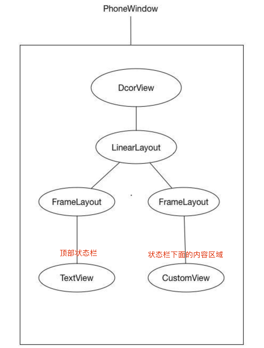 小结:调用setContentView方法,实例化了DecorView, DecorView有两个子布局,一个是加载顶部状态栏的,一个是加载我们的内容布局的,activity添加的xml就是内容布局的一个字元素