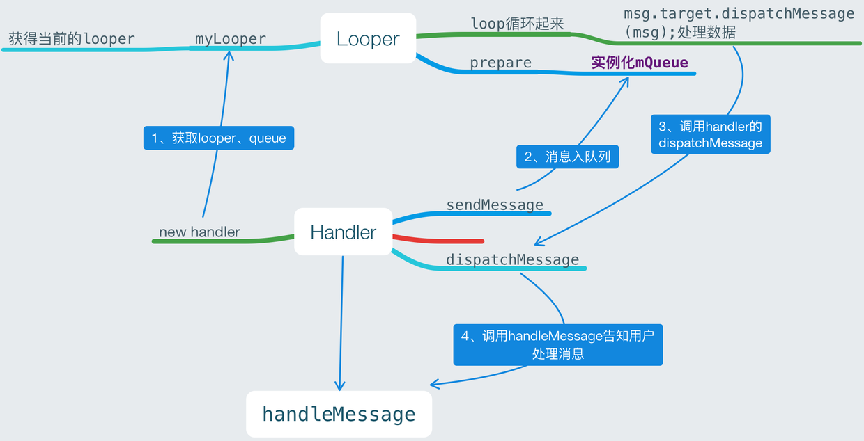 class LooperThread extends Thread {public Handler mHandler;public void run() { Looper.prepare(); mHandler = new Handler() { public void handleMessage(Message msg) { // process incoming messages here } }; Looper.loop(); }当我们使用handler发消息时,步骤是: