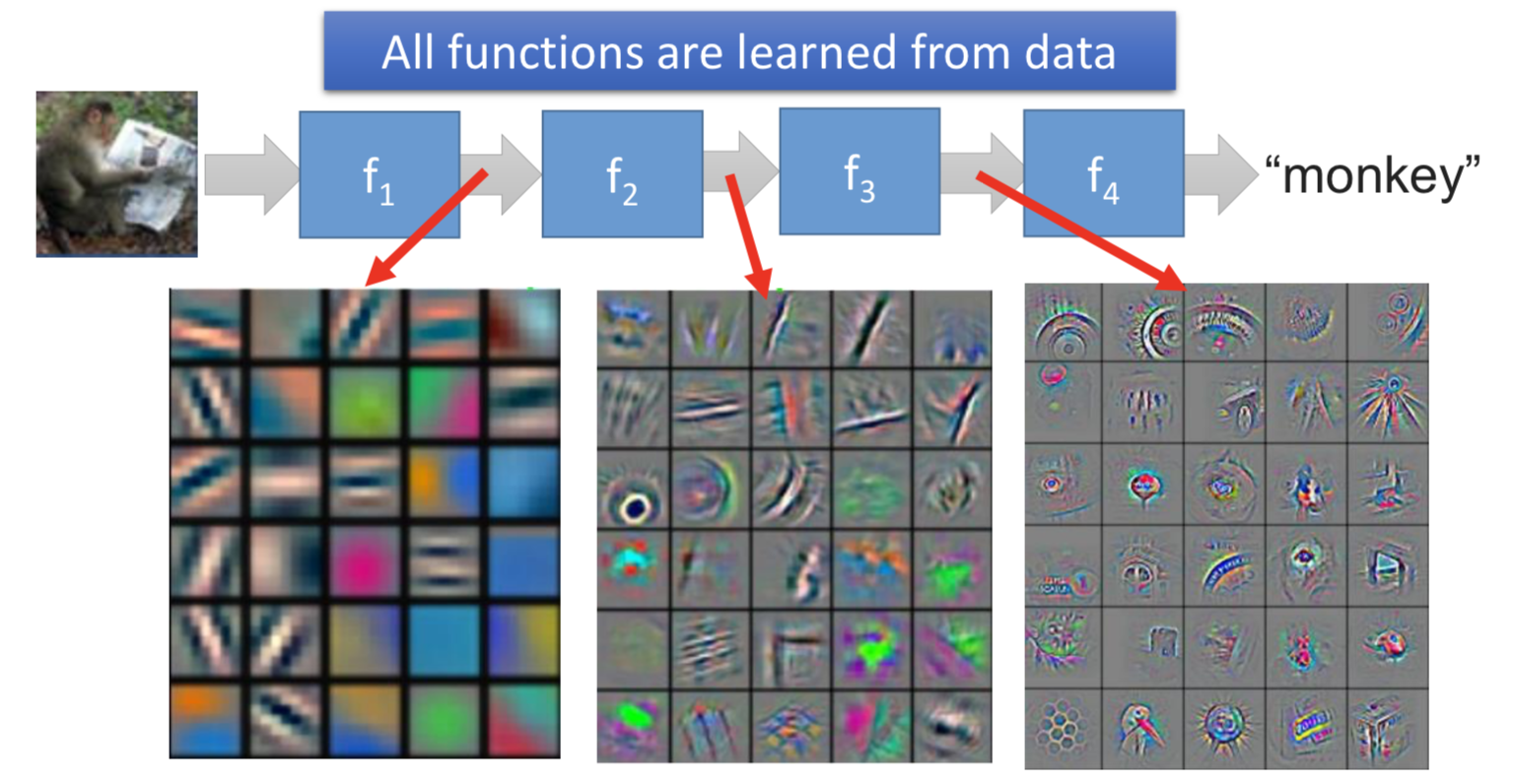 在多层神经网络中,第一个隐含层学习到的特征是最简单的,之后每个隐含层使用前一层得到的特征进行学习,所学到的特征变得越来越复杂。 如图 3 和 4 所示。