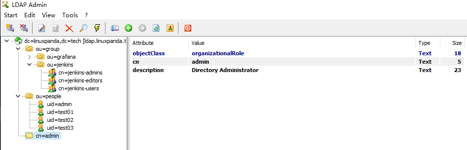# 查询所有用户 [root@VM_0_15_centos ~]# ldapsearch -LLL -w oracle -x -H ldap://ldap.linuxpanda.tech:389 -D"cn=admin,dc=linuxpanda,dc=tech" -b "ou=people,dc=linuxpanda,dc=tech" # 查询特定用户 [root@VM_0_15_centos ~]# ldapsearch -LLL -w oracle -x -H ldap://ldap.linuxpanda.tech:389 -D"cn=admin,dc=linuxpanda,dc=tech" -b "ou=people,dc=linuxpanda,dc=tech" "uid=test01"dn: uid=test01,ou=people,dc=linuxpanda,dc=tech objectClass: posixAccount objectClass: top objectClass: inetOrgPerson gidNumber: 0givenName: test01 sn: test01displayName:: 5rWL6K+VMQ==uid: test01homeDirectory: /home/test01 loginShell: /bin/bashmail: [email protected]:: 5rWL6K+VMQ==uidNumber: 55545userPassword:: e1NIQX1ReE5rdGtVUHhIek52Mm9pQmQvYkc2NjNsQkk9 # 组查询 [root@VM_0_15_centos ~]# ldapsearch -LLL -w oracle -x -H ldap://ldap.linuxpanda.tech:389 -D"cn=admin,dc=linuxpanda,dc=tech" -b "ou=jenkins,ou=group,dc=linuxpanda,dc=tech" # 获取对应的组 [root@VM_0_15_centos ~]# ldapsearch -LLL -w oracle -x -H ldap://ldap.linuxpanda.tech:389 -D"cn=admin,dc=linuxpanda,dc=tech" -b "ou=jenkins,ou=group,dc=linuxpanda,dc=tech" "(& (cn=jenkins-admins) (| (objectclass=groupOfNames) (objectclass=groupOfUniqueNames) (objectclass=posixGroup)))"dn: cn=jenkins-admins,ou=jenkins,ou=group,dc=linuxpanda,dc=tech objectClass: posixGroup objectClass: top cn: jenkins-admins memberUid: test01 memberUid: admin gidNumber: 40109