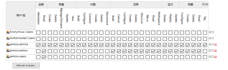 如果用户在ldap里面添加到了jenkins-editors这个组,就拥有上图勾选的权限,这个组的成员可以完成jenkins配置项的修改。这个组一般不对任何人开放,可能给前段或者后端的开发老大开下。