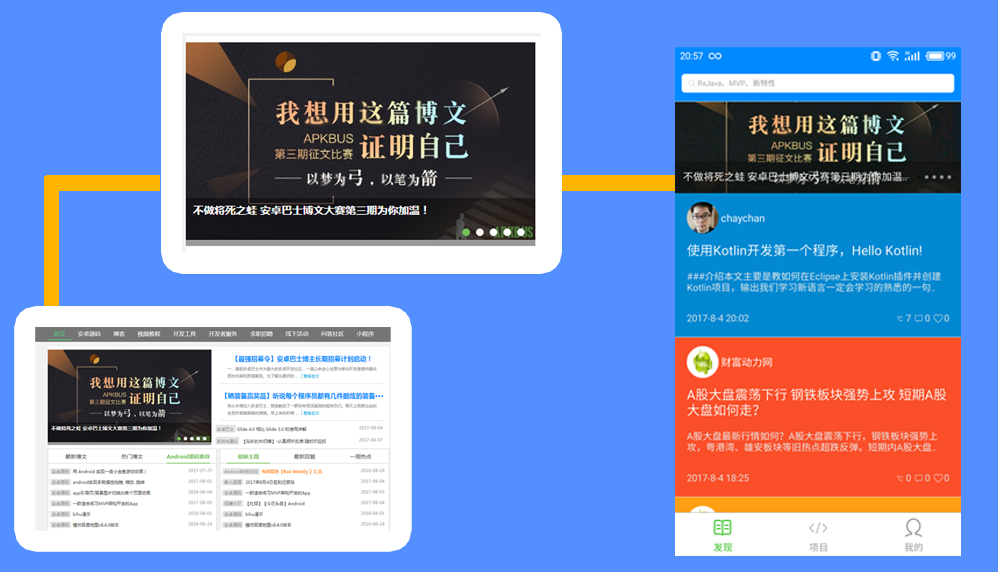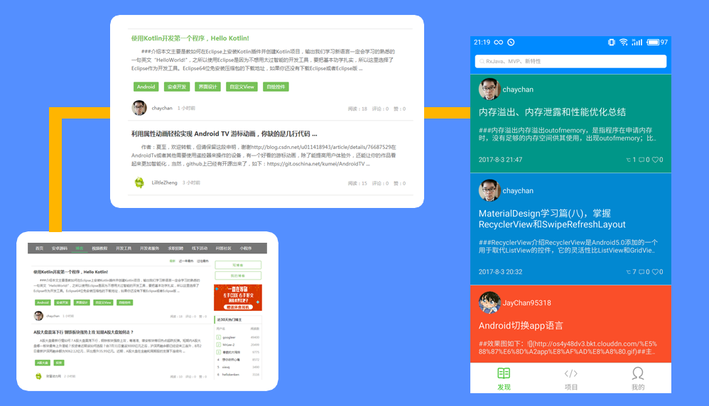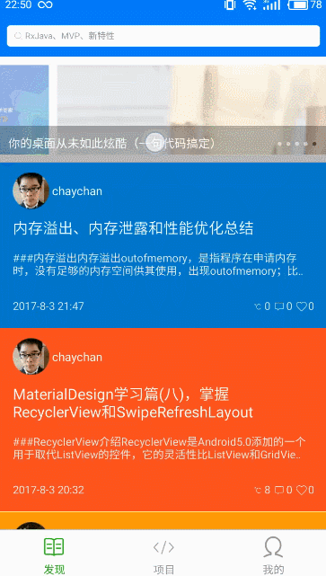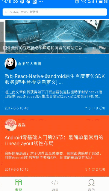 咱们这个项目是依照安卓巴士博客网站动态解析制作的APP。 使用了MVP+RxJava+Retrofit的主流开发套路。 篇幅原因我就不展开讨论如何搭建框架搭建了,尚且网上已有很多优秀的文章。 我们今天重点讲解这次实战中有用的干货知识啦。