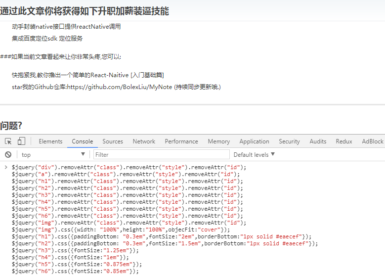 var $jquery = jQuery.noConflict();var content=$jquery('.article');$jquery('body').empty();content.css({background:"#fff",position:"absolute",top:"0",left:"0",});$jquery('body').append(content);$jquery("div").removeAttr("class").removeAttr("style").removeAttr("id");$jquery("a").removeAttr("class").removeAttr("style").removeAttr("id");$jquery("h1").removeAttr("class").removeAttr("style").removeAttr("id");$jquery("h2").removeAttr("class").removeAttr("style").removeAttr("id");$jquery("h3").removeAttr("class").removeAttr("style").removeAttr("id");$jquery("h4").removeAttr("class").removeAttr("style").removeAttr("id");$jquery("h5").removeAttr("class").removeAttr("style").removeAttr("id");$jquery("h6").removeAttr("class").removeAttr("style").removeAttr("id");$jquery("img").removeAttr("class").removeAttr("style").removeAttr("id");$jquery("img").css({width: "100%",height:"100%",objecFit:"cover"});$jquery("h1").css({paddingBottom: "0.3em",fontSize:"2em",borderBottom:"1px solid #eaecef"});$jquery("h2").css({paddingBottom: "0.3em",fontSize:"1.5em",borderBottom:"1px solid #eaecef"});$jquery("h3").css({fontSize:"1.25em"});$jquery("h4").css({fontSize:"1em"});$jquery("h5").css({fontSize:"0.875em"});$jquery("h6").css({fontSize:"0.85em"});我们在android中WebVIew渲染结束后调用即可。 我们使用了WebViewClient来处理,在onPageFinished回调后说明网页已被加载成功。在此处注入js即可。