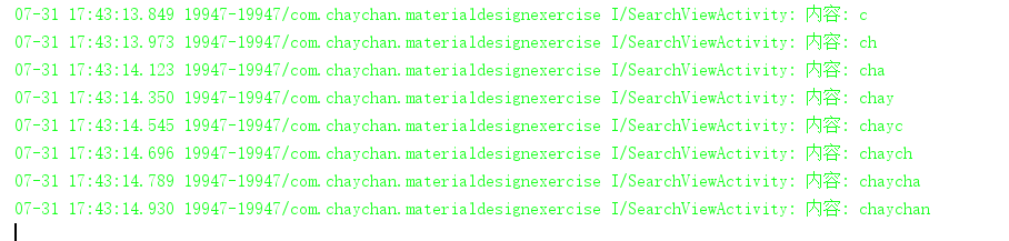 上图中可以看到,输入框的右侧有一个">"图标,即提交按钮,按钮的点击事件在onQueryTextSubmit()方法中回调处理,这里我只是简单弹出搜索框中的内容,当输入框中的内容变化时,会在onQueryTextChange()方法中回调,这里我将变化的内容打印在控制台。