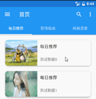 可以看到,TabLayout和ViewPager已经关联起来,当点击页签的时候,ViewPager会切换到对应的fragment,滑动ViewPager,对应页签也会跟着改变。