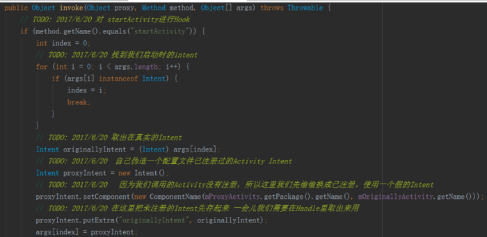 通过动态代理实现对startActivity中的Intent串改,具体逻辑见代码和注释。