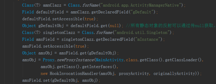 这里我们通过反射获取到AMS的代理本地代理对象Hook以后动态串改Intent为已注册的来躲避检测