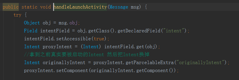 4.对ActivityThread中的handle进行hook。因为前面替换的是壳子,替换真正要启动的Intent。