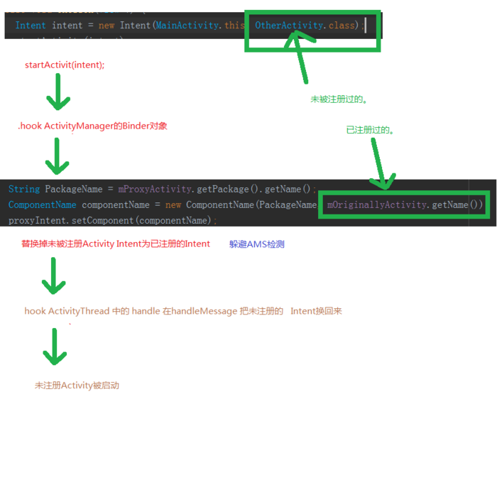 3.用动态代理方式将未被注册Activity的Intent替换成已注册的Activity的Intent,并将未被注册的Intent带过去。(替换壳Activity,躲避AMS服务的检查,也就是欺骗AMS)