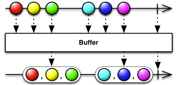 buffer 操作符接受两个参数,buffef(count,skip),作用是将 Observable 中的数据按 skip (步长) 分成最大不超过 count 的 buffer ,然后生成一个 Observable 。也许你还不太理解,我们可以通过我们的示例图和示例代码来进一步深化它。