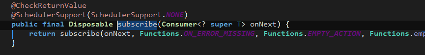 然而,心细的小伙伴可能会发现,由于我们这个是间隔执行,所以当我们的Activity都销毁的时候,实际上这个操作还依然在进行,所以,我们得花点小心思让我们在不需要它的时候干掉它。查看源码发现,我们subscribe(Cousumer<? super T> onNext)返回的是Disposable,我们可以在这上面做文章。