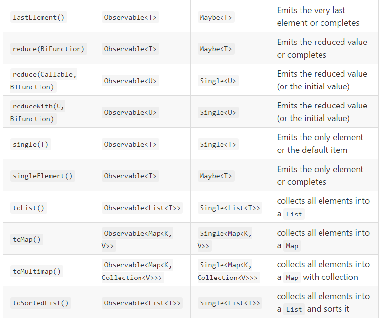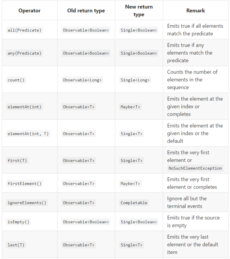 其实这三者都差不多,Single 顾名思义,只能发送一个事件,和 Observable 接受可变参数完全不同。而Completable 侧重于观察结果,而Maybe 是上面两种的结合体。也就是说,当你只想要某个事件的结果(true or false)的时候,你可以使用这种观察者模式。