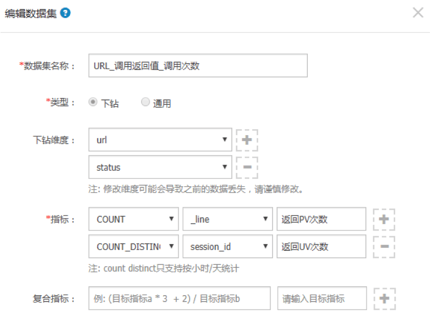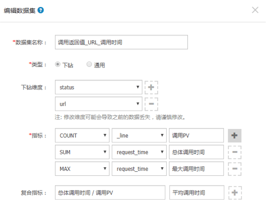 下图是另个数据集配置的例子,该数据集配置出和上例相同但是顺序相反的两个维度: Status 和 URL (支持由 Status下钻到 URL 的查询方式),分别统计两个指标:PV,平均响应时间,最高响应时间 。其中,平均调用时间是复合指标,由总体调用时间 / PV 间接得出。