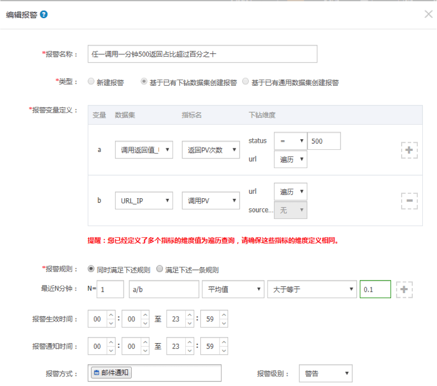 典型如错误码为 5xx 占总调用的占比,通过不同指标复合计算而得。支持各种其他报警高级报警配置