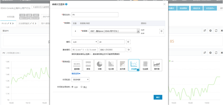 针对 Nginx 监控,ARMS 可以基于类似用户维度,页面维度,IP 维度,甚至地域维度,展示不同的数据。以展示用户总体UV, PV 为例,假设对应的数据集为”整站 UV PV”,则配置如下: