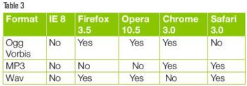 此例使用 Ogg 文件,并且可以在 Firefox、Opera 和 Chrome 中使用。要在 Safari 和 Chrome 的未来版本中使 audio 工作,我们必须添加一个 MP3 和 Wav 文件。