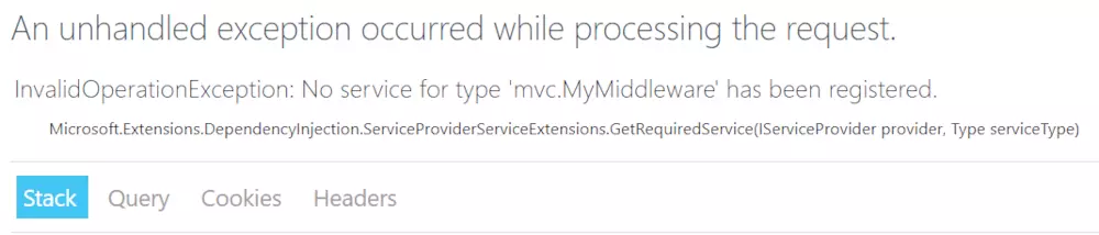 使用IMiddleware类型的中间件需要在容器中进行注册,否则抛异常,具体原因下面分析: