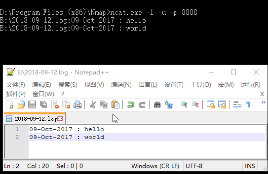下载完成后,命令行进入安装目录,执行命令:ncat.exe -l -u -p 8888 ,监听 UDP 端口。