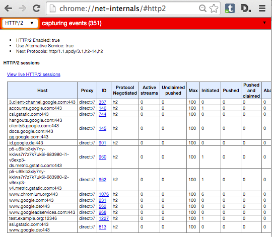 在 Google Chrome 中,你在开发者工具中看不到 HTTP/2 指示器。相反,Chrome 用特殊的地址 chrome://net-internals/#http2 给出了相关信息。(LCTT 译注:Chrome 已经有一个 “HTTP/2 and SPDY indicator” 可以很好的在地址栏识别 HTTP/2 连接)