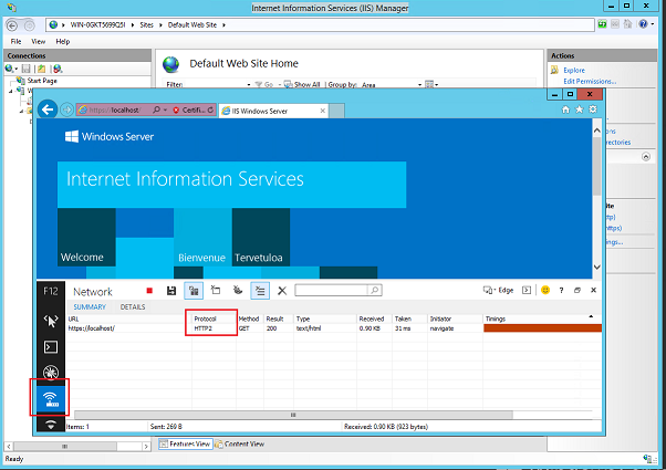 Windows 10 中 Internet Explorer 的继任者 Edge 也支持 HTTP/2。你也可以在开发者工具的网络标签页看到 HTTP/2 协议。