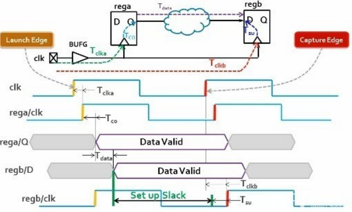 setup slack≥0:T - Tco - Tdata - Tsu ≥ 0 -->T ≥ Tco + Tdata + Tsu