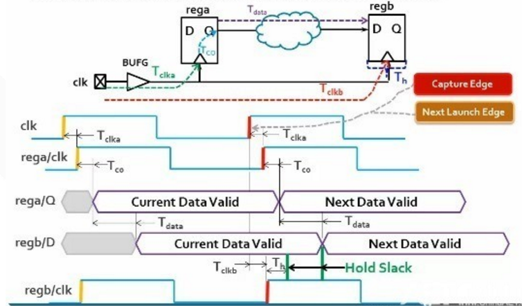 hold slack≥0:-T + Tco + Tdata - Th ≥ 0 --> Th ≤ Tco + Tdata