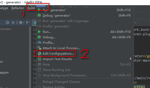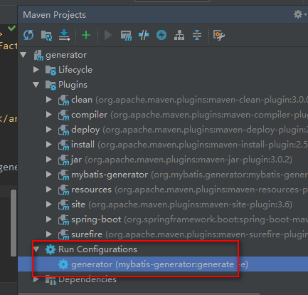 <build> <plugins> <plugin> <groupId>org.springframework.boot</groupId> <artifactId>spring-boot-maven-plugin</artifactId> </plugin> <!-- mybatis逆向工程 --> <plugin> <groupId>org.mybatis.generator</groupId> <artifactId>mybatis-generator-maven-plugin</artifactId> <version>1.3.2</version> <configuration> <!--配置文件的位置--> <configurationFile>src/main/resources/generatorConfig.xml</configurationFile> <verbose>true</verbose> <overwrite>true</overwrite> </configuration> </plugin> </plugins> </build> |