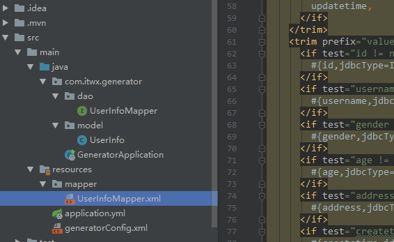 <?xml version="1.0" encoding="UTF-8"?><!DOCTYPE generatorConfiguration PUBLIC "-//mybatis.org//DTD MyBatis Generator Configuration 1.0//EN" "http://mybatis.org/dtd/mybatis-generator-config_1_0.dtd"> <generatorConfiguration> <!--指定特定数据库的jdbc驱动jar包的位置 这里的路径是鄙人的MySQL连接驱动路径--> <classPathEntry location="F:\\MySQL\\mysql-connector-java-5.6-bin.jar"/> <context id="default" targetRuntime="MyBatis3"> <!-- optional,旨在创建class时,对注释进行控制 --> <commentGenerator> <property name="suppressDate" value="true"/> <property name="suppressAllComments" value="true"/> </commentGenerator> <!--jdbc的数据库连接 鄙人的数据源 --> <jdbcConnection driverClass="com.mysql.jdbc.Driver" connectionURL="jdbc:mysql://127.0.0.1:3306/blog" userId="root" password="123456"> </jdbcConnection> <!-- 非必需,类型处理器,在数据库类型和java类型之间的转换控制--> <javaTypeResolver> <property name="forceBigDecimals" value="false"/> </javaTypeResolver> <!-- Model模型生成器,用来生成含有主键key的类,记录类 以及查询Example类 targetPackage 指定生成的model生成所在的包名 targetProject 指定在该项目下所在的路径 --> <javaModelGenerator targetPackage="com.itwx.generator.model" targetProject="src/main/java"> <!-- 是否允许子包,即targetPackage.schemaName.tableName --> <property name="enableSubPackages" value="false"/> <!-- 是否对model添加 构造函数 --> <property name="constructorBased" value="true"/> <!-- 是否对类CHAR类型的列的数据进行trim操作 --> <property name="trimStrings" value="true"/> <!-- 建立的Model对象是否 不可改变 即生成的Model对象不会有 setter方法,只有构造方法 --> <property name="immutable" value="false"/> </javaModelGenerator> <!--Mapper映射文件生成所在的目录 为每一个数据库的表生成对应的SqlMap文件 --> <sqlMapGenerator targetPackage="mapper" targetProject="src/main/resources"> <property name="enableSubPackages" value="false"/> </sqlMapGenerator> <!-- 客户端代码,生成易于使用的针对Model对象和XML配置文件 的代码 type="ANNOTATEDMAPPER",生成Java Model 和基于注解的Mapper对象 type="MIXEDMAPPER",生成基于注解的Java Model 和相应的Mapper对象 type="XMLMAPPER",生成SQLMap XML文件和独立的Mapper接口 --> <javaClientGenerator targetPackage="com.itwx.generator.dao" targetProject="src/main/java" type="XMLMAPPER"> <property name="enableSubPackages" value="true"/> </javaClientGenerator> <!--鄙人的数据库表名和要生成的实体类名--> <table tableName="user_info" domainObjectName="UserInfo" enableCountByExample="false" enableUpdateByExample="false" enableDeleteByExample="false" enableSelectByExample="false" selectByExampleQueryId="false"> </table> </context></generatorConfiguration> |