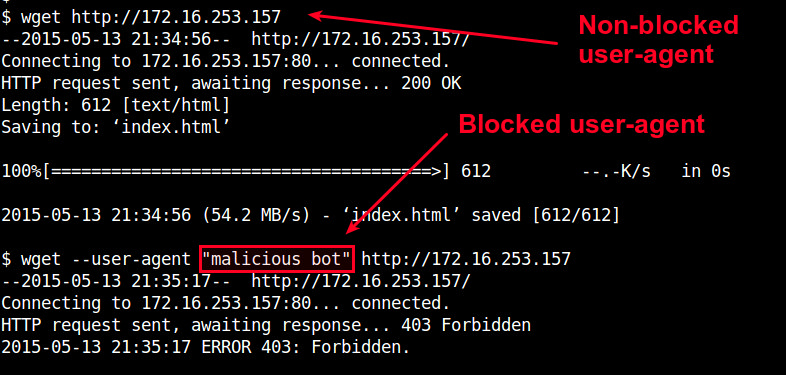 $ wget --user-agent "malicious bot" http://<nginx-ip-address>