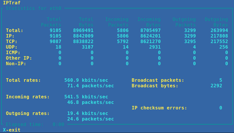 IPTraf:基于命令行的网络统计数据查看器。它实时显示包层面、连接层面、接口层面、协议层面的报文/字节数。抓包过程由协议过滤器控制,且操作过程全部是菜单驱动的。(LCTT 译注:延伸阅读。)