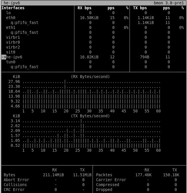 bmon:一个基于命令行的带宽监测工具,可以显示各种接口相关的信息,不但包括接收/发送的总量/平均值统计数据,而且拥有历史带宽使用视图。