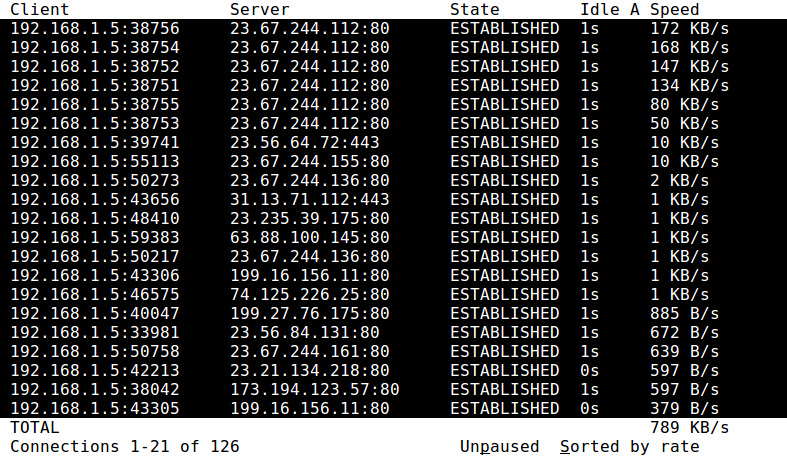 iftop:一个带宽使用监测工具,可以实时显示某个网络连接的带宽使用情况。它对所有带宽使用情况排序并通过ncurses的接口来进行可视化。他可以方便的监控哪个连接消耗了最多的带宽。(LCTT 译注:延伸阅读。)