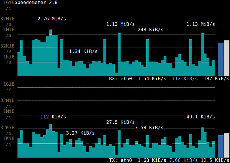 speedometer:一个可视化某个接口发送/接收的带宽使用的历史趋势,并且基于ncurses的条状图进行显示的终端工具。