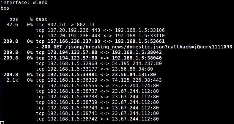 pktstat:一个命令行式的工具,通过实时分析报文,显示连接带宽使用情况以及相关的协议(例如,HTTP GET/POST、FTP、X11)等描述信息。
