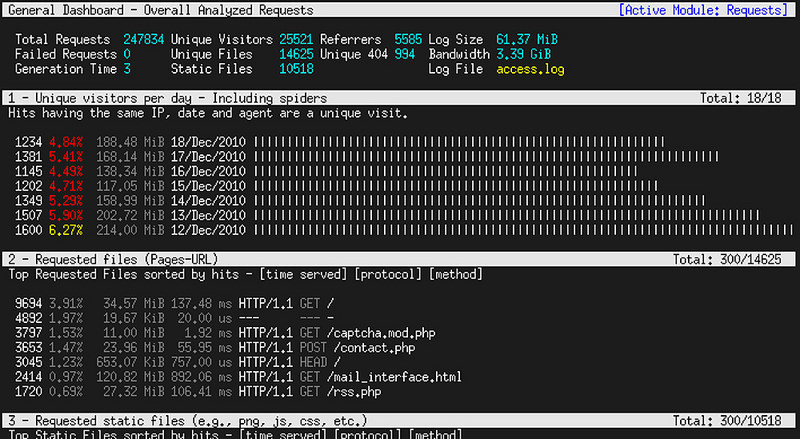 GoAccess:一个针对Apache和Nginx服务器流量的交互式查看器。基于对获取到的日志的分析,它能展示包括日访问量、最多请求、客户端操作系统、客户端位置、客户端浏览器等在内的多个实时的统计信息,并以滚动方式显示。