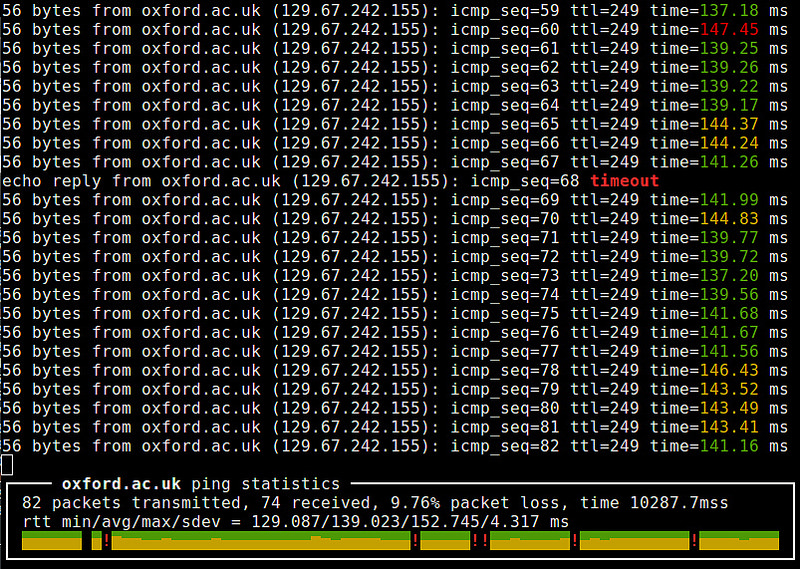 ping:一个常用的网络测试工具。通过交换ICMP的echo和reply报文来实现其功能。它在测量路由的RTT、丢包率以及检测远端系统防火墙规则时很有用。ping的变种有更漂亮的界面(例如,noping)、多协议支持(例如,hping)或者并行探测能力(例如,fping)。(LCTT 译注:延伸阅读。)
