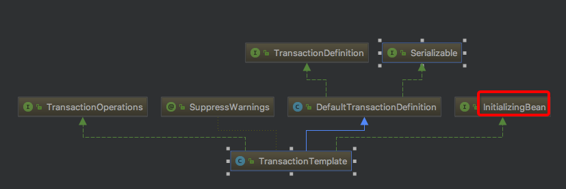 31 }如上图,TransactionOperations这个接口用来执行事务的回调方法,InitializingBean这个是典型的spring bean初始化流程中(飞机票:Spring IOC(四)总结升华篇)的预留接口,专用用来在bean属性加载完毕时执行的方法。