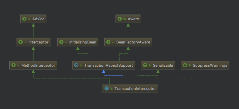 TransactionInterceptor使用通用的spring事务基础架构实现“声明式事务”,继承自TransactionAspectSupport类(该类包含与Spring的底层事务API的集成),实现了MethodInterceptor接口。spring类图如下: