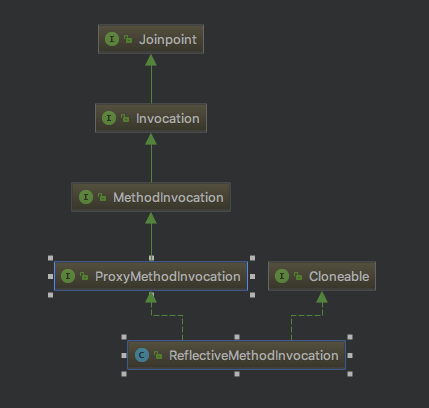 如上图,ReflectiveMethodInvocation类实现了ProxyMethodInvocation接口,但是ProxyMethodInvocation继承了3层接口...ProxyMethodInvocation->MethodInvocation->Invocation->Joinpoint