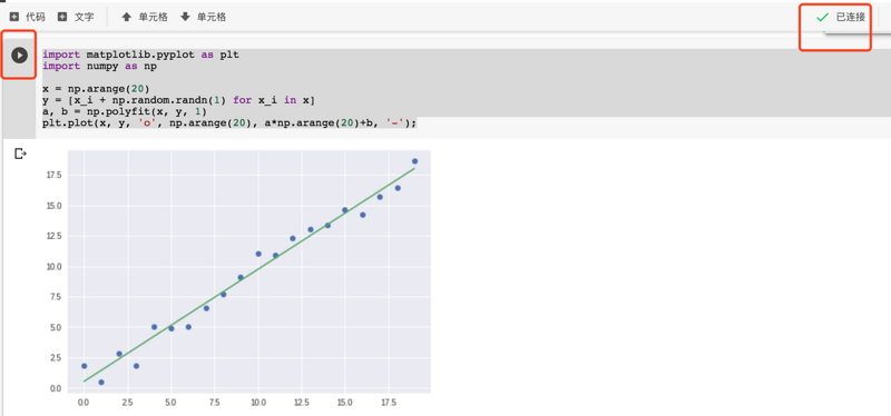 这里添加一行代码,输入下面的一个案例.然后点击左侧的运行按钮,这样就可以在下面看到运行的结果了.