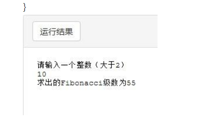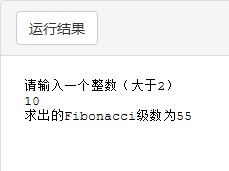 #include <iostream>using namespace std;int fibonacci(int n);int main() {int n;cout << "請輸入一個整數(大于2)" << endl;cin >> n;cout << "求出的Fibonacci級數為" << fibonacci(n) << endl;return 3;}int fibonacci(int n){int F1 = 1;int F2 = 1;if (n == 3)return 2;elsereturn fibonacci(n - 1) + fibonacci(n - 2);}